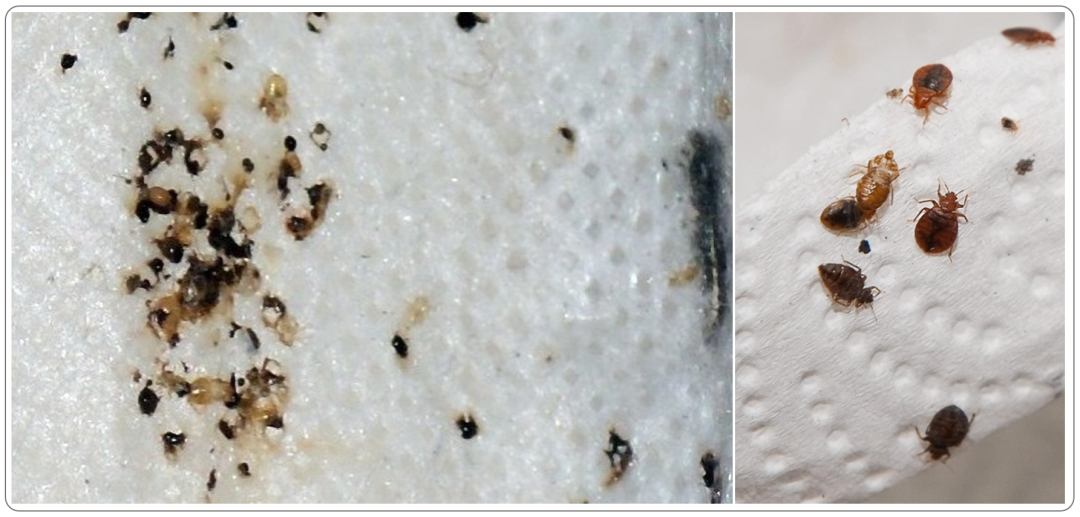 外观:臭虫粪便很小,在床上用品、床垫或家具等表面上表现为微小的黑点或污迹。它们类似于小墨渍或铁锈色的点。常见的场所:常见于臭虫的藏身之处附近,包括床垫、弹簧箱、床架或软垫家具。
